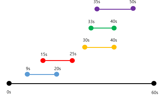 시청자들의 시청구간 = [ 9s ~ 20s , 15s ~ 25s , 30s ~ 40s , 33 ~ 40s , 35s ~ 50s ]