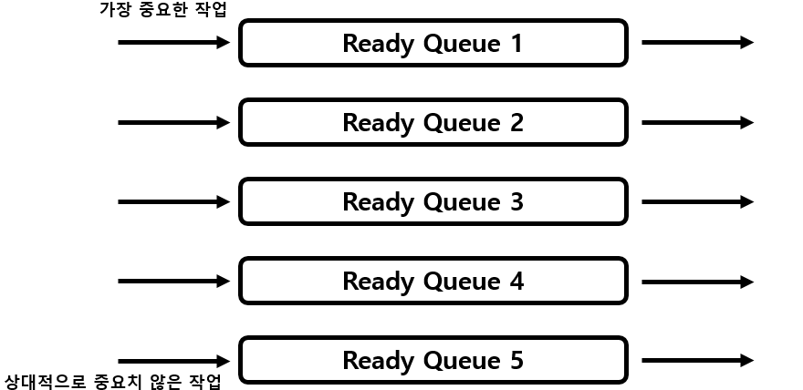 - 중요도에 따라서 1차적으로 어떤 Qqueue에 저장할지 우선순위를 정하고, 두 번째로 각 Queue에서는 서로 다른 알고리즘