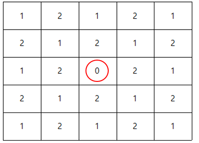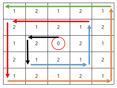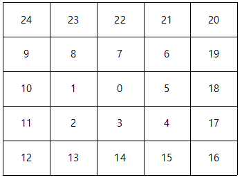 위의 그림이 5 x 5 맵에서 각 좌표들이 가지는 번호들이다. 이 번호들을 위의 규칙들을 이용해서 파악할 수 있는 것이다.