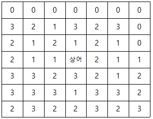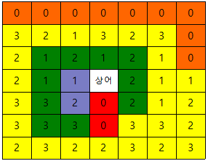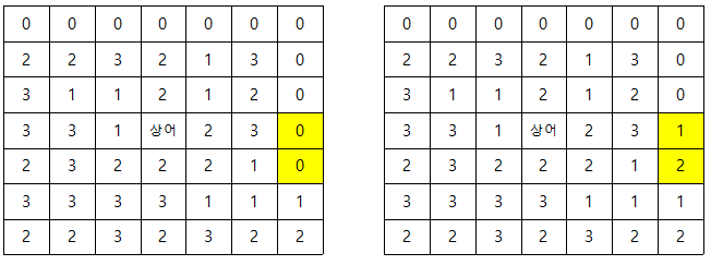 이 상태에서 상어가 아래 방향으로 2칸 얼음 파편을 던지게 되면 다음과 같은 부분이 얼음파편에 맞게 된다.