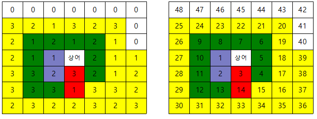 우리는 위와 같은 특징 및 규칙들을 이용해서 "주어진 맵에서, 각 좌표가 가지는 번호" 에 대해서 파악할 수 있다.