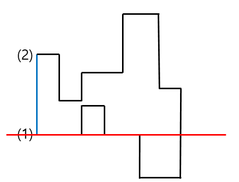 그럼, 저 위에서 했던 그림과 같이 임의의 빨강색 선이 아래에서 부터 한칸씩 순차적으로 올라온다고 가정해보자. 그럼 (1)번 지점이 되는 순간 교차되는 횟수가 하나 더 더해질 것이다. 그림으로 표현해보면 다음과 같다.