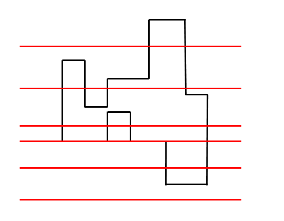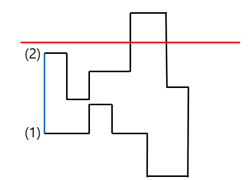 이와 같은 직각다각형이 있다고 가정해보자. 그리고 먼저, 아래 그림과 같이 빨강색 가로선분이 아래에서 위쪽으로 한칸 씩 올라가는 상황이라고 시뮬레이션을 한번 해보자.